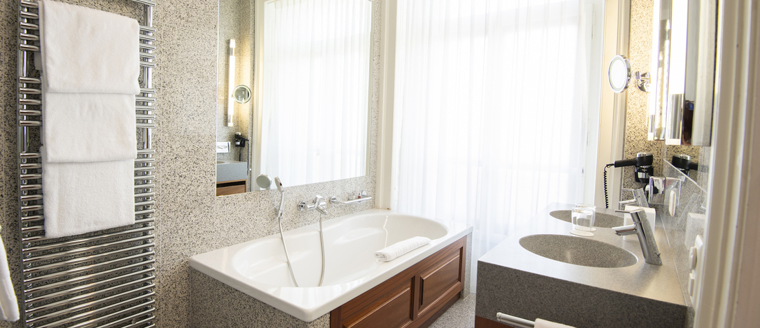 - Salle de bain avec baignoire ou douche : Certaines chambres disposent d’une salle de bain historique, Radiateur porte-serviettes pour plus de confort